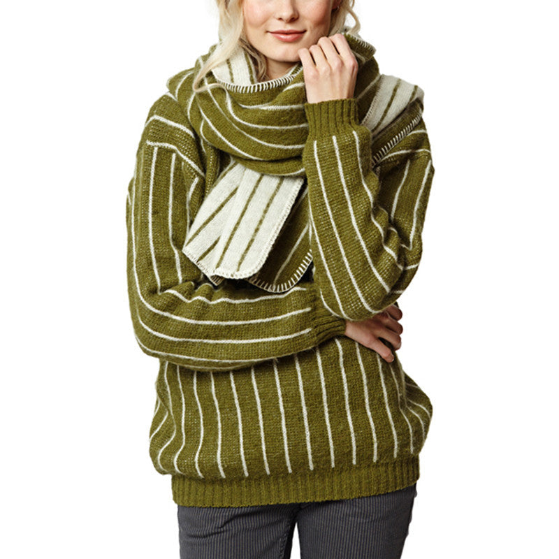 - Dömu fyrirsætan klæðist Sprota trefli, Sprota peysu í stærð 1 og Fitjum buxum í stærð 36